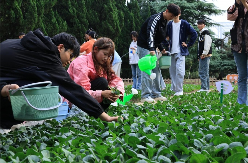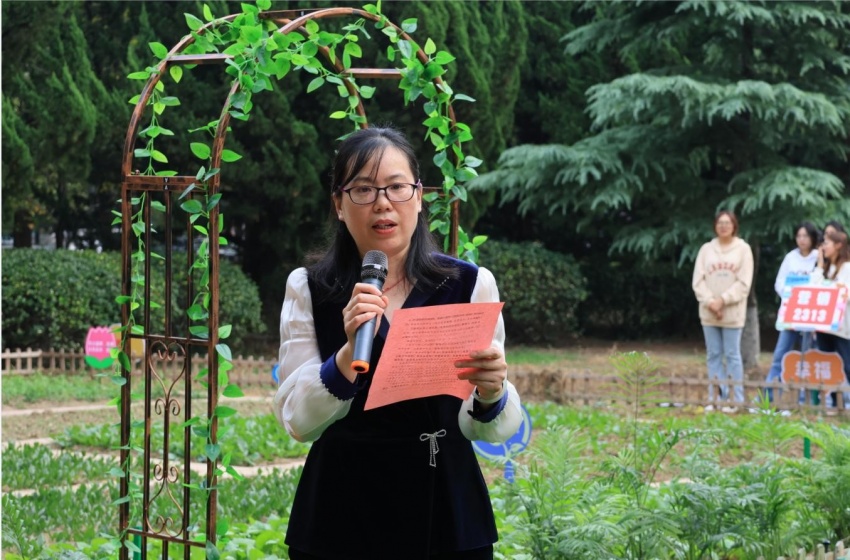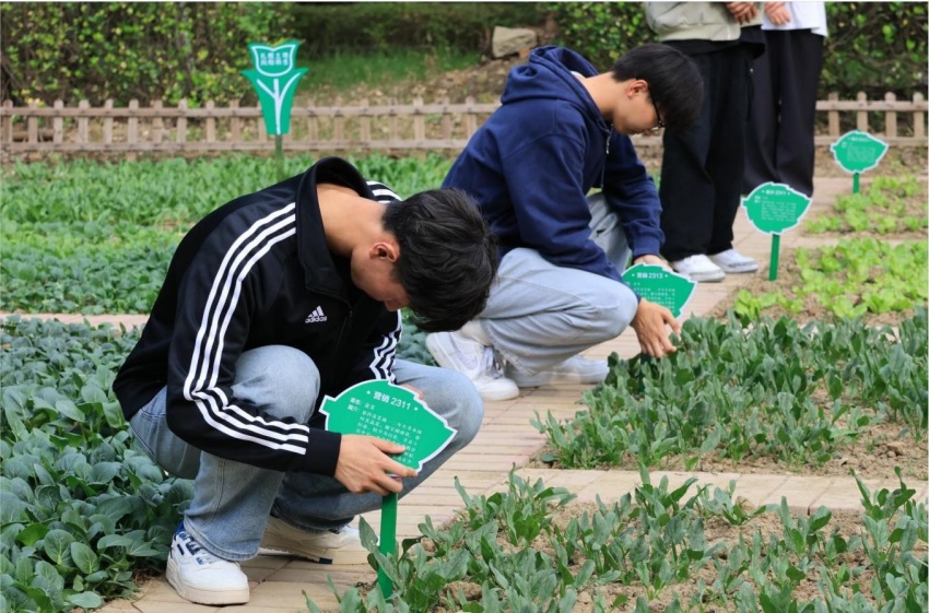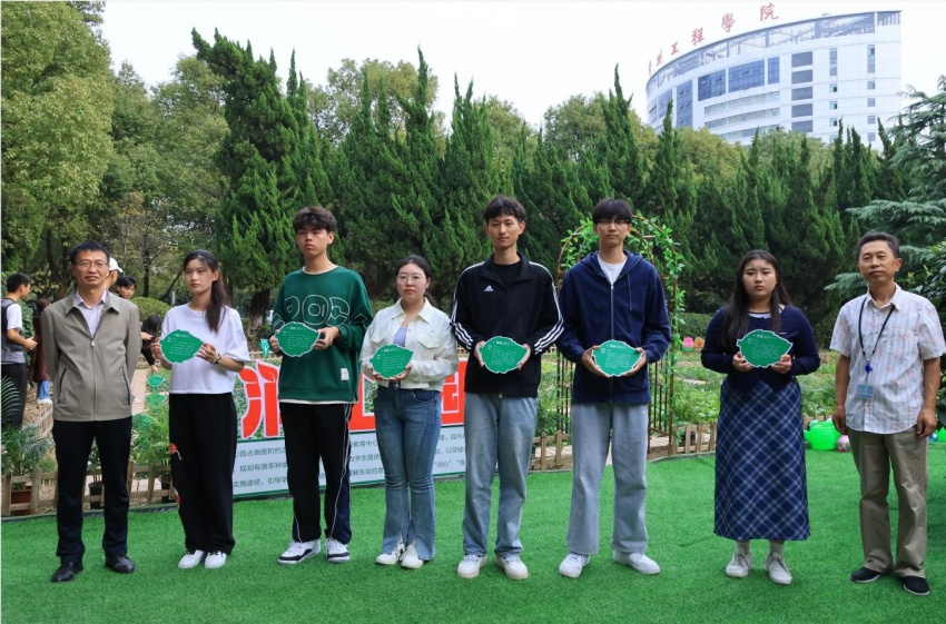 高馨为园艺基地建设指导老师颁发聘书。张卫平和徐标为2023级各班颁发印着班级和作物名称的专属铭牌,各班负责人郑重地将专属铭牌插在责任田中。