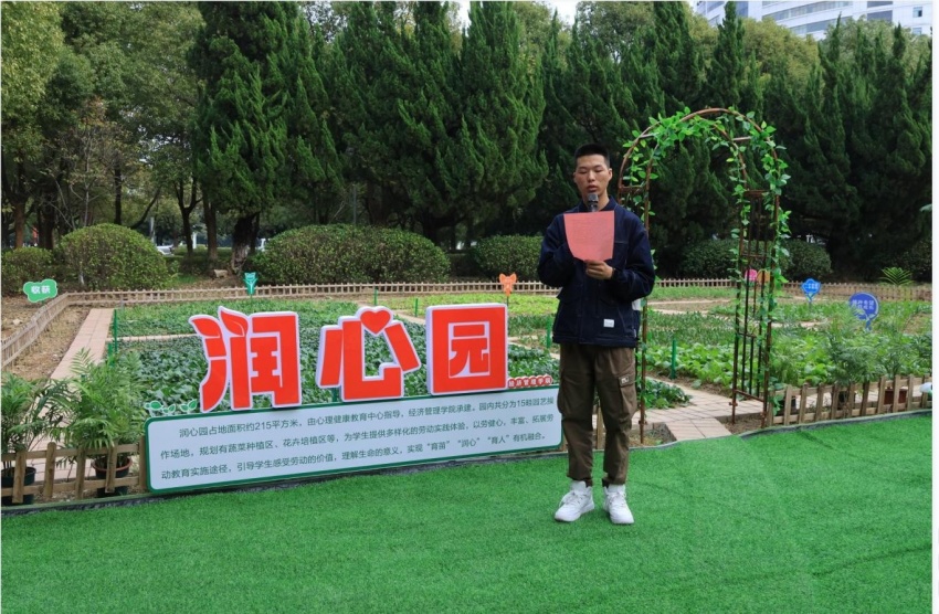 员工代表酒管2311班胡可政分享了在润心园的劳动实践体会,他感性地说道:“土地不会辜负每一个辛勤耕耘的人,看到禾苗破土的那一刻,那种生命力的感染性是言语无法表达的。学期初荒芜的一块土地,在大家的辛勤劳作下,已经变得绿意盎然,在劳动的过程中,我们不仅锻炼了身体,更增进了友谊,体会到了挥洒汗水的快乐。”